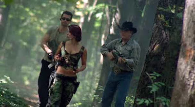 The hunters are the most obvious team you could imagine; we have arrogant rich man, his girlfriend who doesn’t wear many clothes, silent broody killer, brash macho man who hits on rich-man’s lady, snake-fodder old man and a bumbling father-son duo. Their inclusion is a little odd; rich-man is supposed to have rounded up the cream of the hunting crop, others who really enjoy killing big animals but the father-son pair are simply too stupid to have been included. Sadly, their comic-relief is not particularly comic…