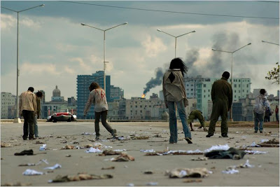 The basic premise is left beautifully stark. Havana is overrun with zombies. Juan and friends are trying to survive. That’s about all there is to it. Like many of the classics they don’t waste much time on life-before-zombies and they certainly don’t bother explaining where the zombies come from - although the TV reporter blames American imperialists, a neat joke on both Cuban news/propaganda and the (modern) zombie’s links to American consumerism. For the most part it just throws us into the middle of the fray as the Juan, his estranged daughter, his best friend and a couple of others start bashing, slashing, smashing and splattering zombies.