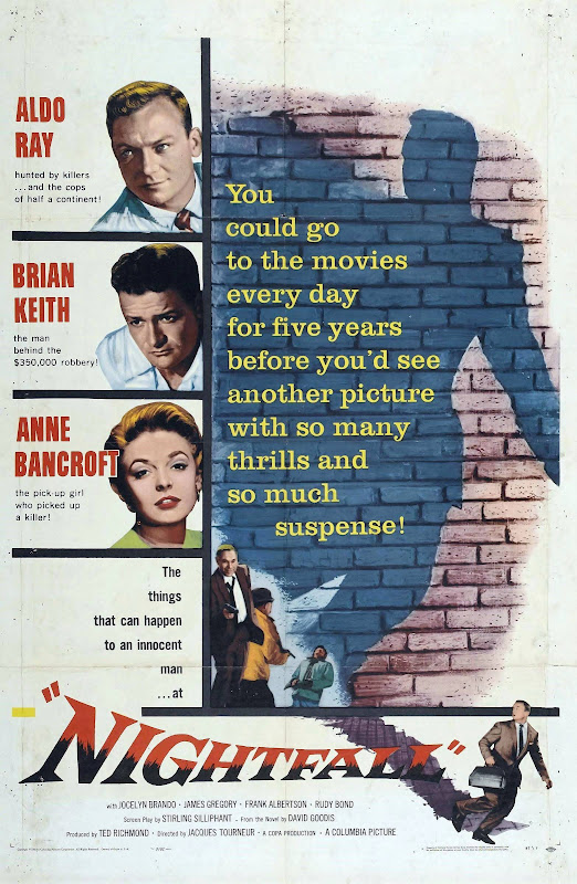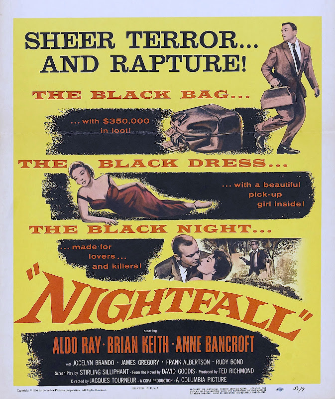 Here are a couple of posters for Jaques Tourneur’s Nightfall (IMDb) from 1957, starring Aldo Ray, Brian Keith and Anne Bancroft. I don’t write much about the films for these Poster Hunt posts (as I select them for artwork rather than the film - most of them I haven’t seen), so if you do want to know more about the film I’ll direct you to this comprehensive blog post at Noir of the Week.